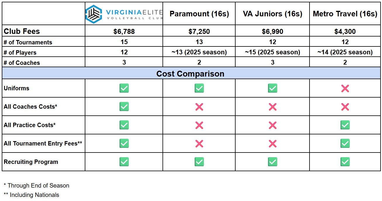 The illustration below compares 'apples to apples' and outlines how the all inclusive nature of Virginia Elite 16s team club fees pricing compares to other area clubs' 16s team.